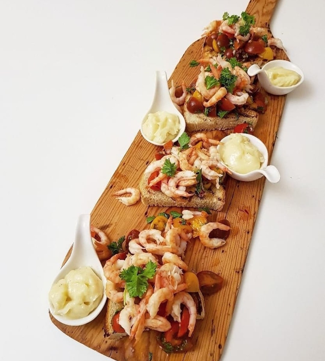 Toppa brödet med tomatsallad och de skalade räkorna. Servera med aioli.