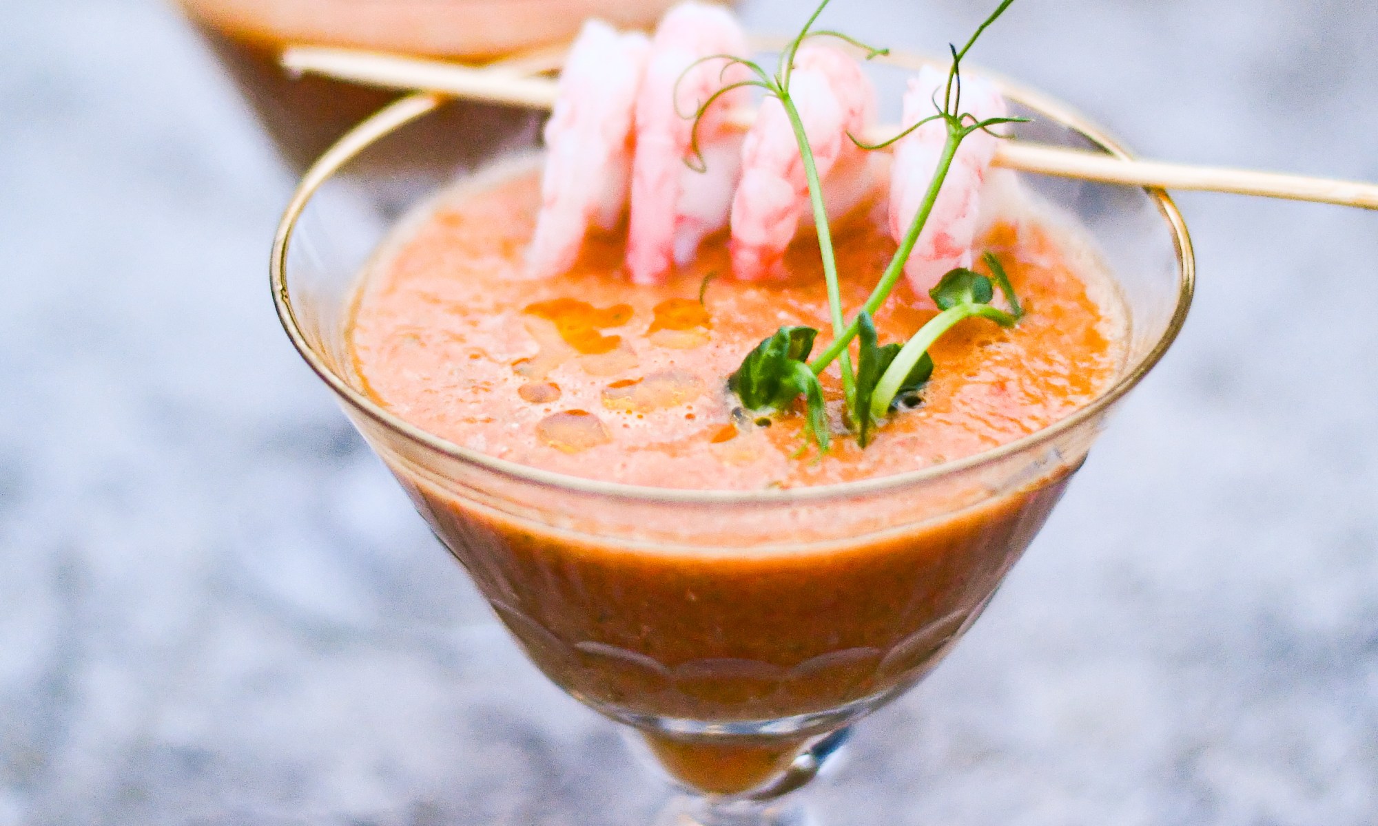 6 port 1 banan-schalottenlök 0.5 liten grön paprika 0.5 liten röd paprika 0.5 gurka 1 burk hela körsbärstomater 1 vitlöksklyfta 0.5 dl olivolja 1.5 msk vinäger 1 tsk honung 1 tsk selleri salt Tabasco några stänk Worcestershire sauce några stänk Räkor handskalade Krasse och/eller ärtskott Stoppa alla ingredienser förutom räkor och kryddgrönt i en mixer …