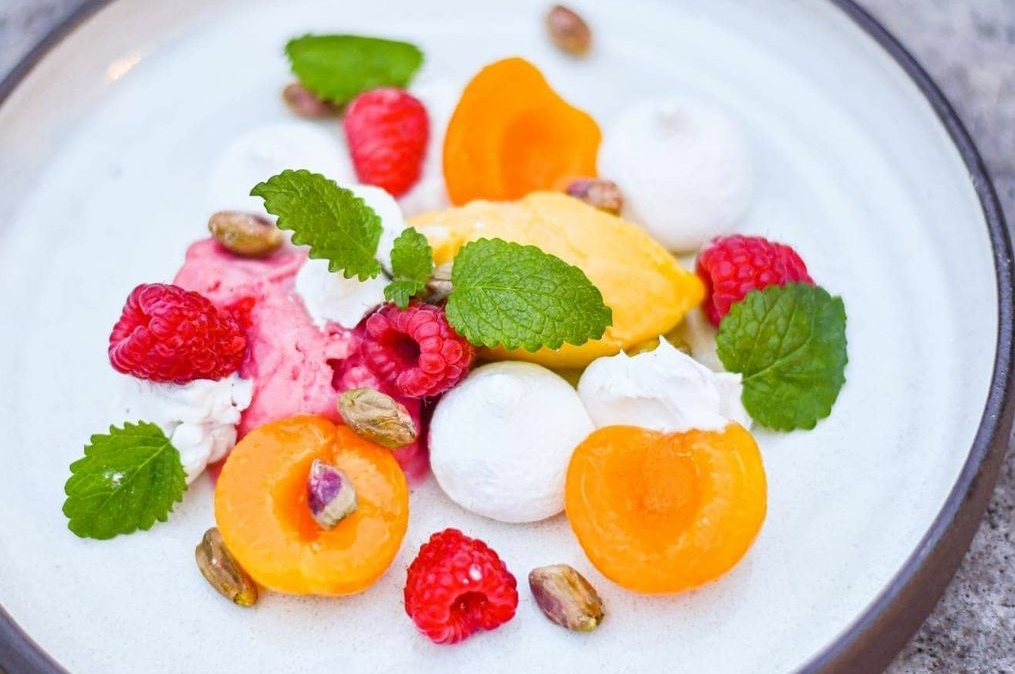 Mangosorbet Hallonsorbet 1 burk kokosgrädde 2 tsk limejuice 2 tsk vaniljsocker 1 burk aprikoshalvor Maräng 1 frp färska hallon 1 dl skalade pistagenötter 1 kruka citronmellis Slå bort ca hälften av vätskan i koksgrädden och vispa den med limejuice och vaniljsockret. Torrosta nötterna en liten stund i en stekpanna Arrangera ingredienserna vackert på tallrikar.