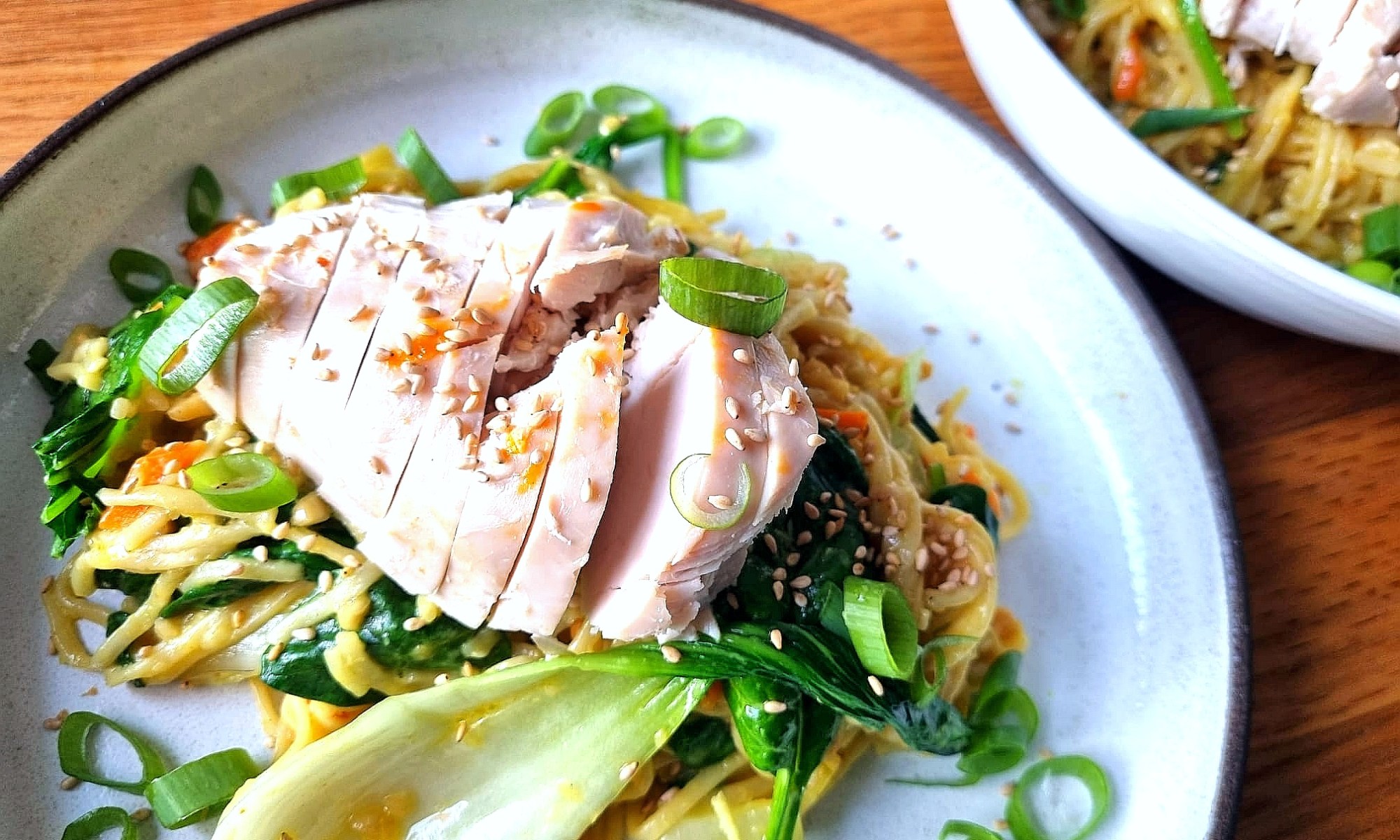 Snabblagad nudelwok med krämig jordnötssås och grillad kyckling4-5 port