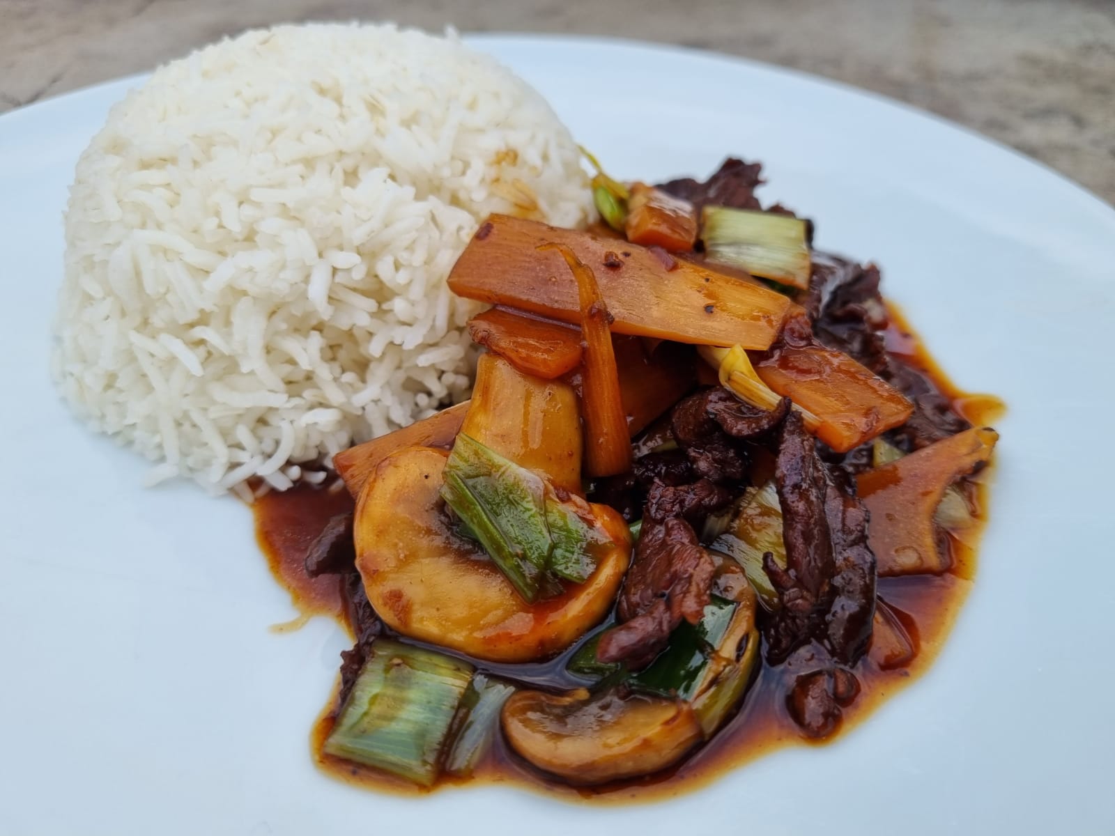 400 g lövbiff 1 msk finriven ingefära 3 msk japansk soja 1 msk majsstärkelse 1 tsk bikarbonat Skär köttet i strimlor. Blanda övriga ingredienser och häll över köttet. Låt marinera minst två timmar, men gärna över natten. Bikarbonaten gör köttet extra mört. Stek köttet i lite olja. 1 liten purjolök 8 st färska champinjoner (valfritt) …