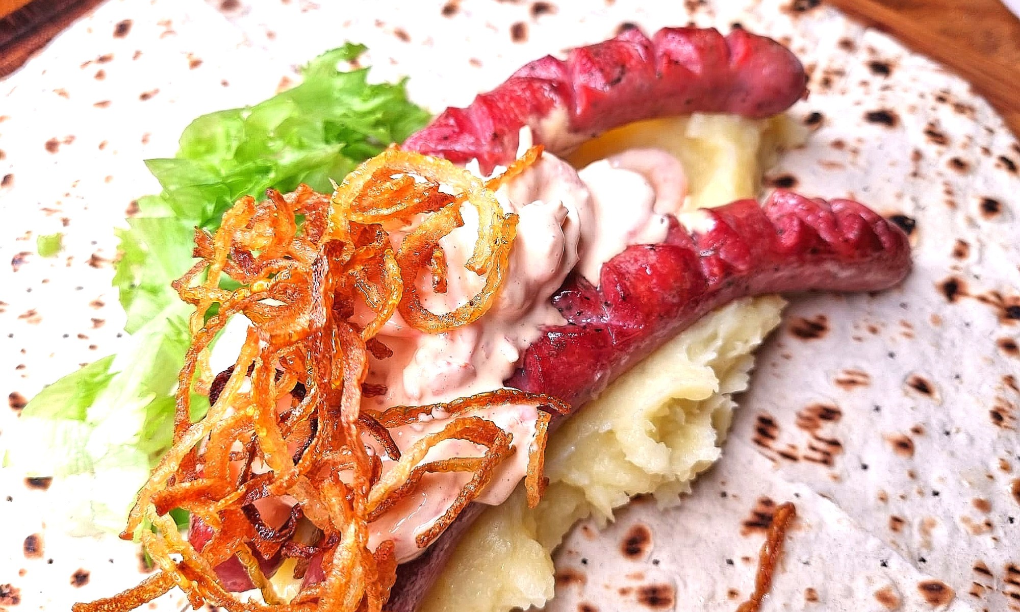 8 st korvar av hög kvalitet gärna lammkorv 4 tunnbröd stora Tryffel-Potatispure: 1 kg potatis mjölig 50 g smör 1.5 dl mjölk 1 tsk tryffelolja 1 tsk salt 1 nypa vitpeppar malen Skala och dela potatisen i mindre bitar och koka den mjuk i lättsaltat vatten. Smält smöret och värm mjölken. Pressa potatisen och rör …