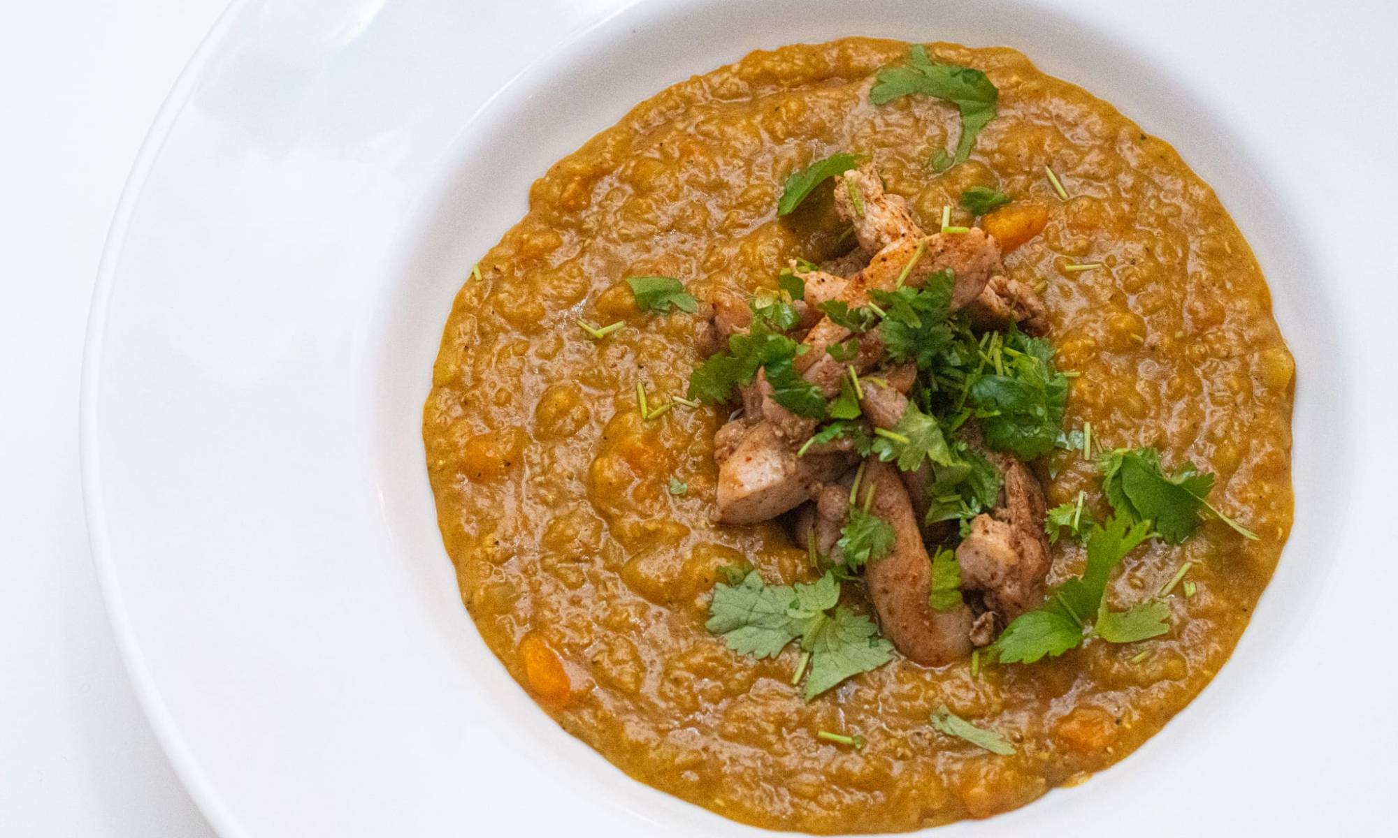600 g kycklinglårfilé 2 morötter 1 gul lök 2 vitlöksklyftor pressade 4 cm ingefära riven 1 tsk gurkmeja 1 tsk spiskummin 1 tsk mald koriander 1 tsk mald chilipeppar 200 g röd linser 1 liter vatten 2 tsk salt 1 kycklingbuljongtärning Matfett att steka i Skala och hacka morot och lök. Stek någon minut i …