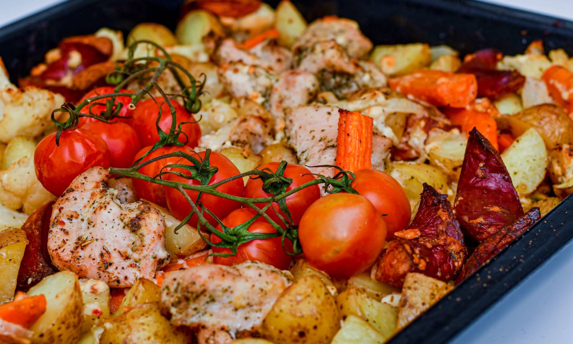 4 port 700 g potatis 300 g morötter 200 g blomkål 1 gul lök 3 vitlöksklyftor 1.5 msk santa maria örtagård krydda salt/peppar Rapsolja 500 g kycklingfile' 300 g chorizo 1 frp fetaost 200 g plommontomater Börja med att dela potatis, morötter, blomkål, lök och vitlök i grova bitar. Lägg alla grönsaker i en långpanna. …